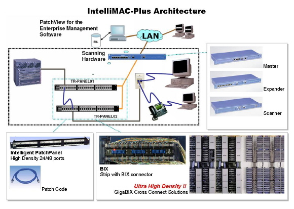 IntelliMAC-Plus 솔루션을 통한 모니터링으로 여러분의 시스템 품질을 유지할 수 있습니다. 이 솔루션은 정보를 포트와 집중된 데이터베이스에 실시간으로 주고받도록 해주는 구조화 케이블 배선 시스템에 삽입된 센서에 기반을 두고 있습니다.
